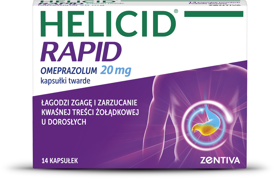 Helicid Rapid to lek zawierający omeprazol, który należy do grupy inhibitorów pompy protonowej. Jego głównym działaniem jest zmniejszanie ilości kwasu wydzielanego w żołądku, co pomaga w leczeniu objawów refluksu, takich jak zgaga i zarzucanie kwaśnej treści żołądkowej. Lek jest przeznaczony do krótkotrwałego stosowania u dorosłych pacjentów, a jego działanie może być odczuwalne po 2-3 dniach stosowania. Helicid Rapid nie jest zalecany dla dzieci i młodzieży poniżej 18 roku życia. Kapsułki należy przyjmować na pusty żołądek, najlepiej o tej samej porze każdego dnia.